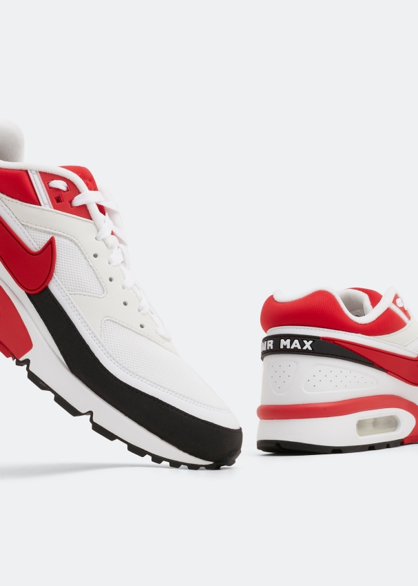 يأتي سنيكرز اير ماكس بي دبليو بمزيج من النسيج الشبكي والجلد باللون الأبيض مع اللونين الأحمر والأسود. يأتي بقاعدة باللون الأبيض مع واقيات طين باللون الأسود وتفاصيل باللون الأحمر بالإضافة إلى علامة "إير" مرئية على الكعب ونعل خارجي مطاطي.